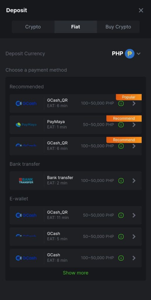 - For fiat transactions, choose your preferred method (for instance, credit card, e-wallet options like GCash) and adhere to the outlined steps to finalize your deposit, which may involve furnishing payment specifics and defining the deposit quantum.