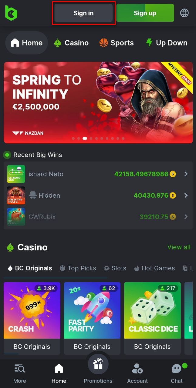 - Find and tap theSign in button. Once on the BC.Game site, look for the “Sign in” button, prominently displayed.